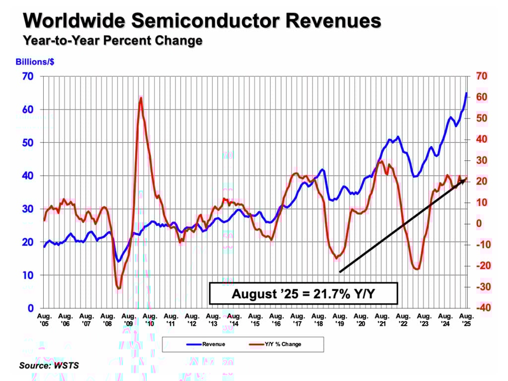 The Semiconductor Industry Association (SIA) says global semiconductor sales were $64.9 billion during the month of August 2025, an increase of 21.7% compared to the August 2024 total of $53.3 billion and 4.4% more than the July 2025 total of $62.1 billion.