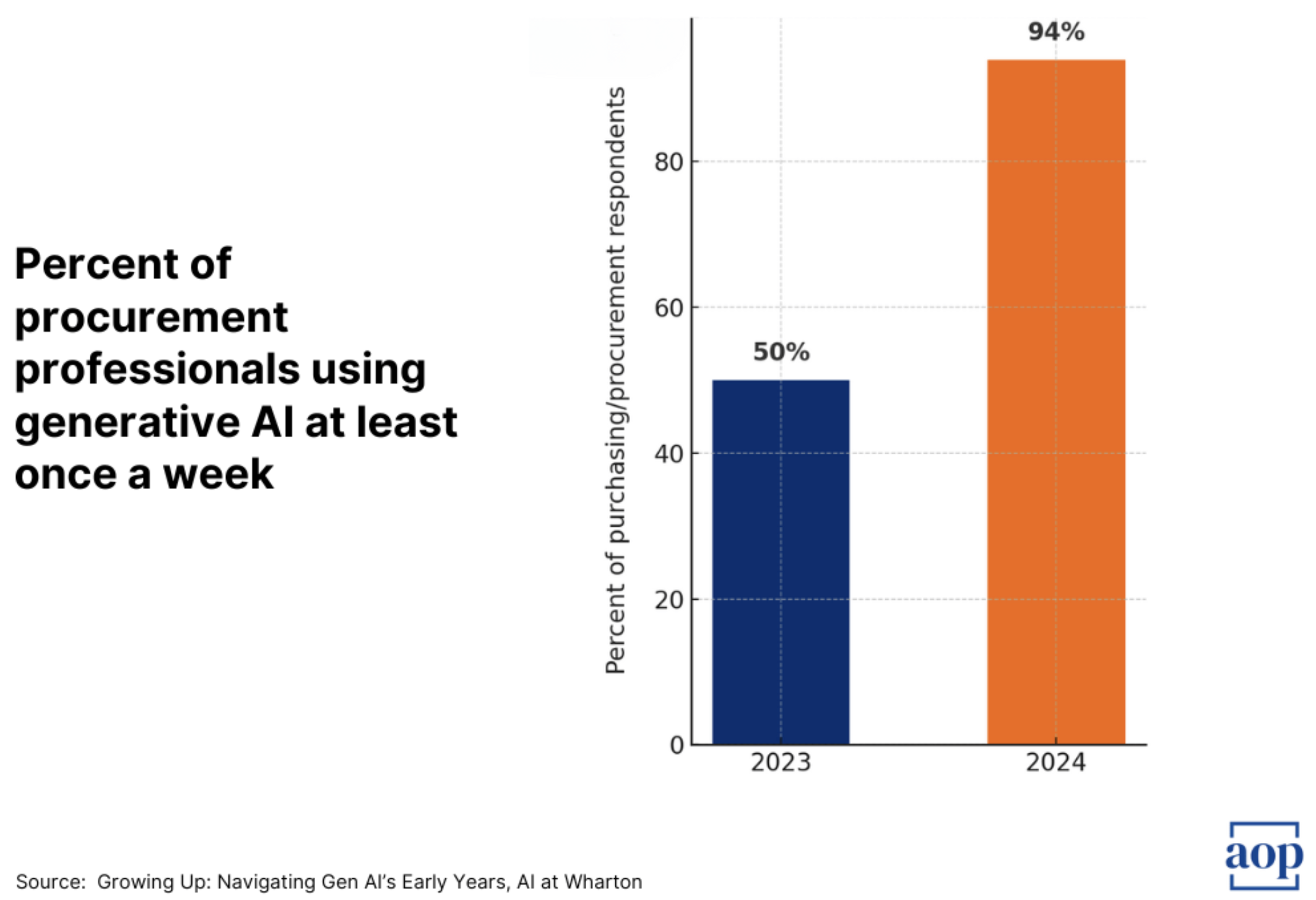 Procurement professionals are recognising this need. The Art of Procurement drew data from Wharton research on AI, which showed that the weekly use of Gen AI for purchasing and procurement increased by 44% from 2023 to 2024, at which point 94% of respondents were using Gen AI at least once per week (Figure 1). That was 2024; much has undoubtedly changed since then.