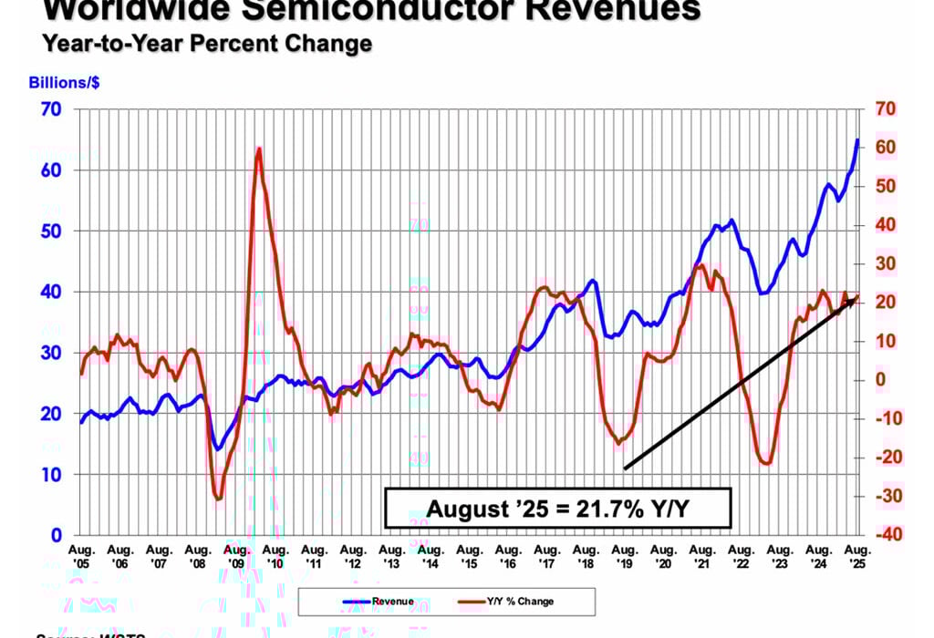The Semiconductor Industry Association (SIA) says global semiconductor sales were $64.9 billion during the month of August 2025, an increase of 21.7% compared to the August 2024 total of $53.3 billion and 4.4% more than the July 2025 total of $62.1 billion. AsiaPacific and All Other led the way chalking up a year on year