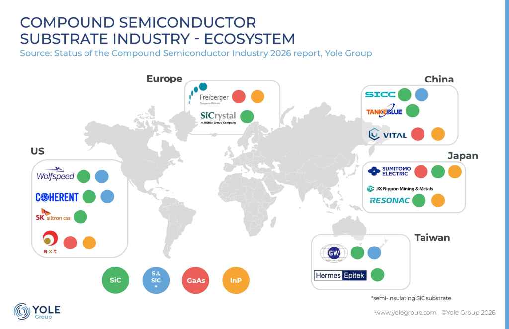 Yole Group’s Status of the Compound Semiconductor Industry 2026 – Focus on Substrates and Epiwafers report provides a comprehensive assessment of substrate and open epiwafer markets across power, RF, photonics, and display applications, with forecasts through 2031. It analyses material evolution, wafer-size transitions, competitive positioning, and ecosystem dynamics. Yole Group’s study also examines capacity expansion, vertical integration strategies, and regional supply chain developments shaping the next phase of industry growth.