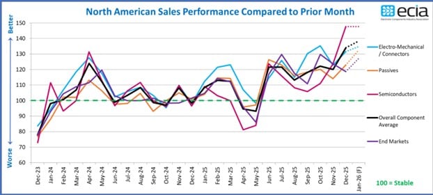 “The latest results from ECIA’s Industry Pulse survey delivered highly encouraging results as we move into early 2026,” commented ECIA Chief Analyst Dale Ford. “The two prior surveys followed a disturbing pattern where survey participants reported strong confidence in the current month, followed by a complete collapse in sales expectations for the following month. The December Industry Pulse survey results break strongly from this plague of self-doubt and show renewed confidence as we enter the new year.”