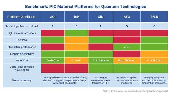 These different requirements have pushed quantum tech players to experiment with materials beyond the usual silicon-based platforms. Promising candidates with suitable properties include silicon nitride (SiN), which is largely compatible with existing silicon-based processes, or thin-film lithium niobate (TFLN) and barium titanate (BTO), which have a high electro-optic coefficient suited for extremely fast modulation of light. However, TFLN and BTO are far less commercially mature than silicon photonics, limited to smaller wafer sizes, high price tags, and only a handful of foundries that are able to work with these materials.