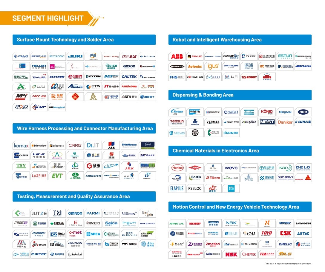 The 2026 floor plan has been released to accurately align with business opportunities. The exhibition will continue to take place in Halls E1-E5 and W1-W4. Each exhibition hall is arranged based on categories of exhibits and application areas, featuring a well-structured and strategic layout. This design allows exhibitors to effectively showcase their core strengths while enabling visitors to efficiently identify and focus on their target products. The exhibits cover the entire electronics manufacturing industry chain, including component manufacturing, test and measurement, quality assurance, new energy vehicle inspection technology, surface mount technology (SMT), electronics manufacturing services (EMS), automated electronic assembly, clean technology, cable processing, electronic chemical materials, dispensing and bonding technology, robotics, AGV, intelligent warehousing, sensor technology, motion control and drive technology, new energy vehicle technology as well as automotive PLC Industrial control system.