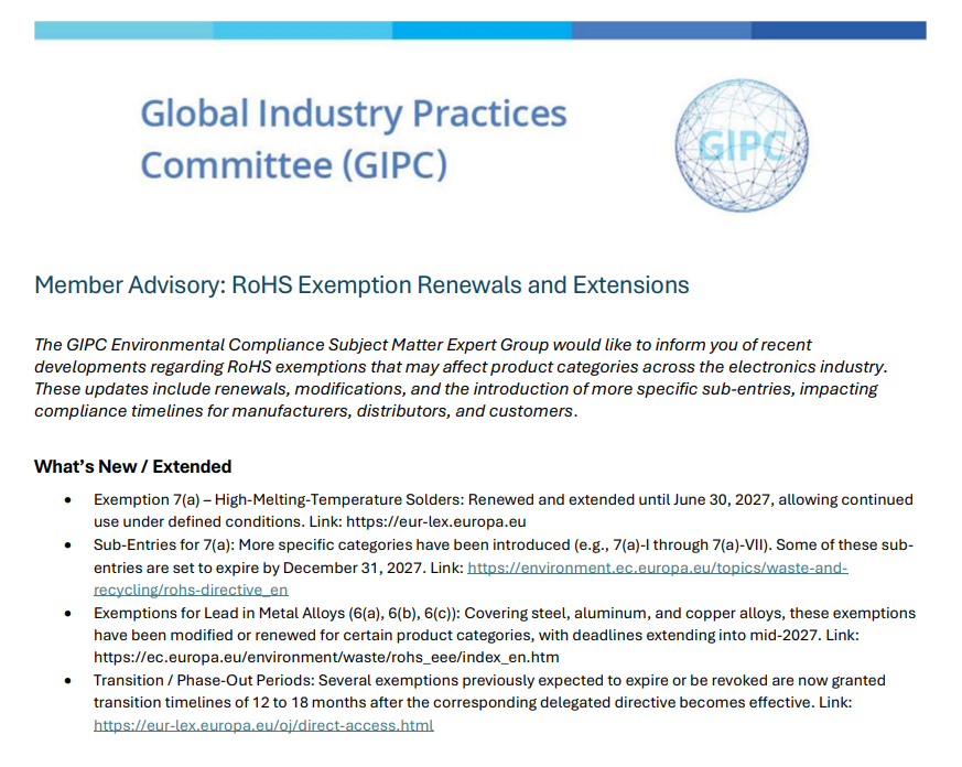 ECIA’s GIPC Environmental Compliance Subject Matter Expert Group has published a document to update members about recent developments regarding Restrictions on Hazardous Substances (RoHS) exemptions that may affect product categories across the electronics industry.